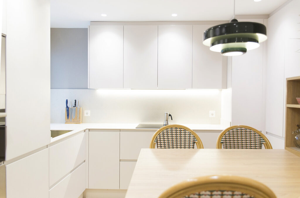 La cocina, aunque da a un patio interior, se resolvió con un muro bajo y un cerramiento en cristal y aluminio lacado en blanco. Esto permite mantenerla independiente sin aislarla, y deja que la luz fluya hacia el salón y la entrada, generando una sensación de amplitud y luminosidad en todo el conjunto.
