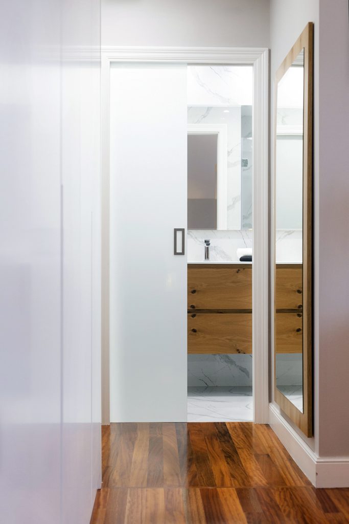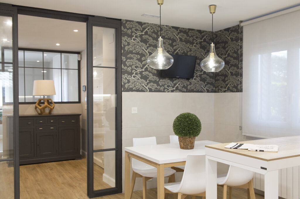 Para lograrlo, abrimos el hueco de acceso a la cocina e instalamos unas puertas correderas de hierro y vidrio, acompañadas de dos fijos laterales en cristal que amplifican la luz y comunican visualmente los espacios. También eliminamos las puertas del salón, dejando un murete bajo y un cerramiento superior de hierro y cristal a juego, que conecta con la entrada y unifica el conjunto.